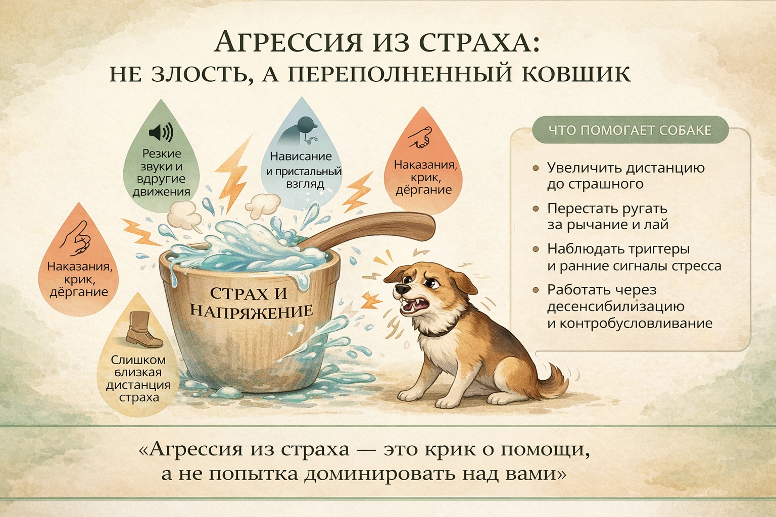 Собака в этот момент не рассуждает: «я сделала плохо, меня наказывают». Она ощущает лишь боль, резкий дискомфорт или ваш гнев сверху и делает вывод: «когда появляются люди/дети/собаки, потом становится ещё больнее». Агрессия из страха закрепляется и может становиться жёстче — до укусов без «предупреждения».