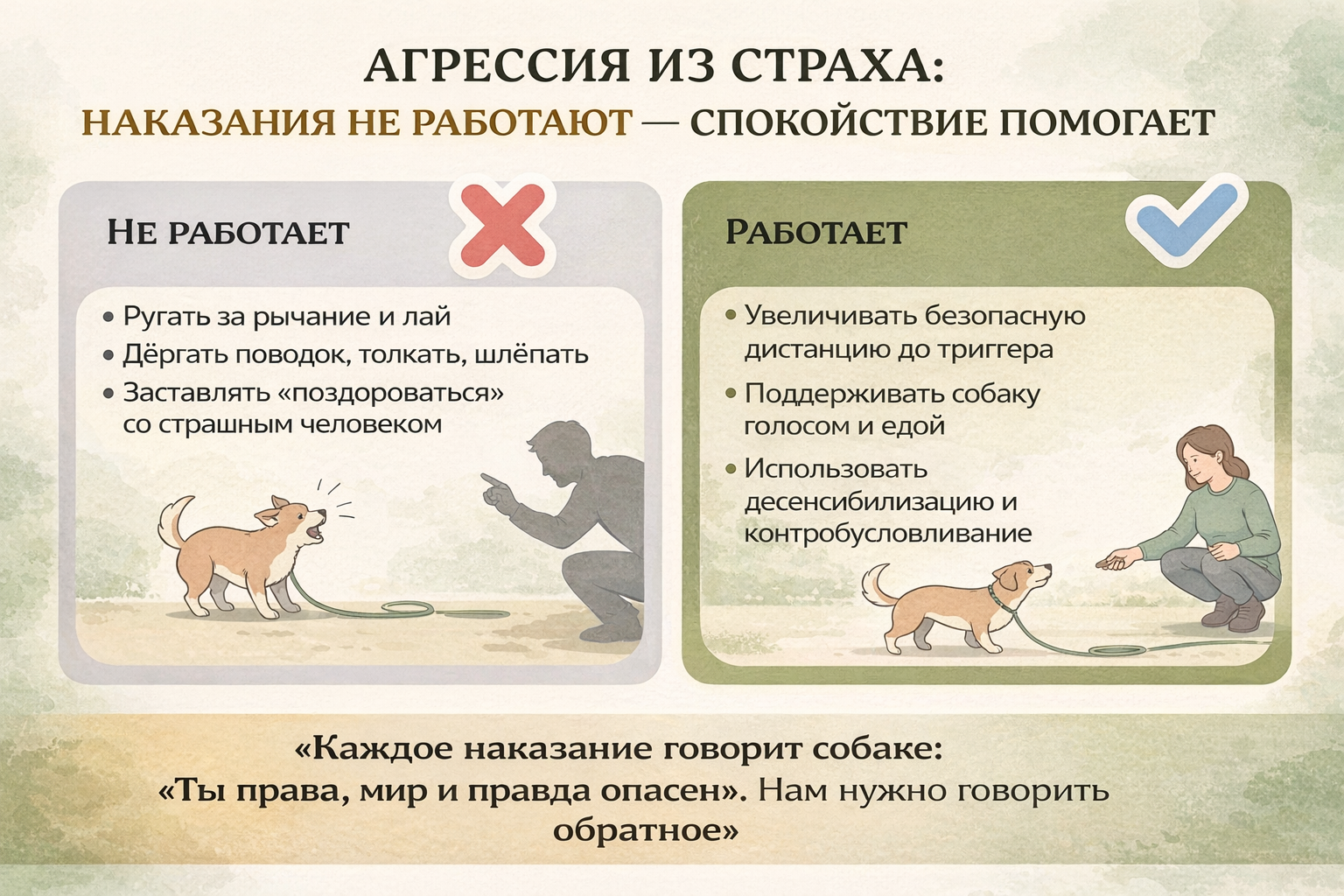 Современный подход Fear Free как раз про это: не ломать, а создавать новые, хорошие ассоциации с миром. Исследования Американской ассоциации ветеринарных бихевиористов (AVSAB) подчёркивают, что положительное подкрепление и десенсибилизация в коррекции дают более устойчивый и безопасный результат, чем любые силовые методы.