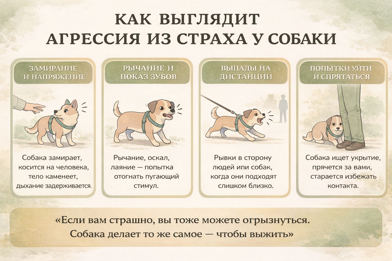 Четыре типичных проявления агрессии из страха у собаки в наглядных карточках.