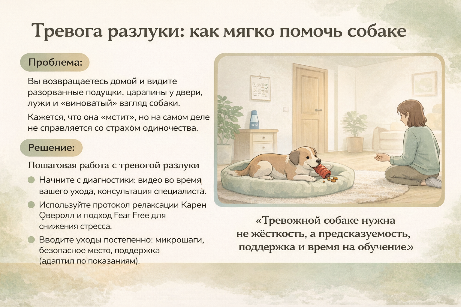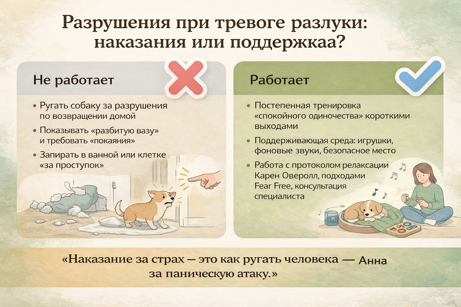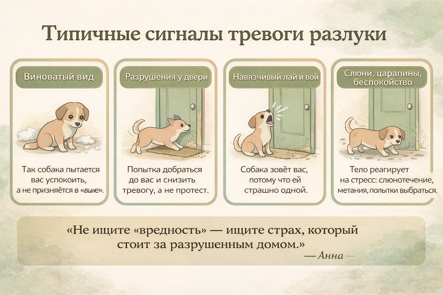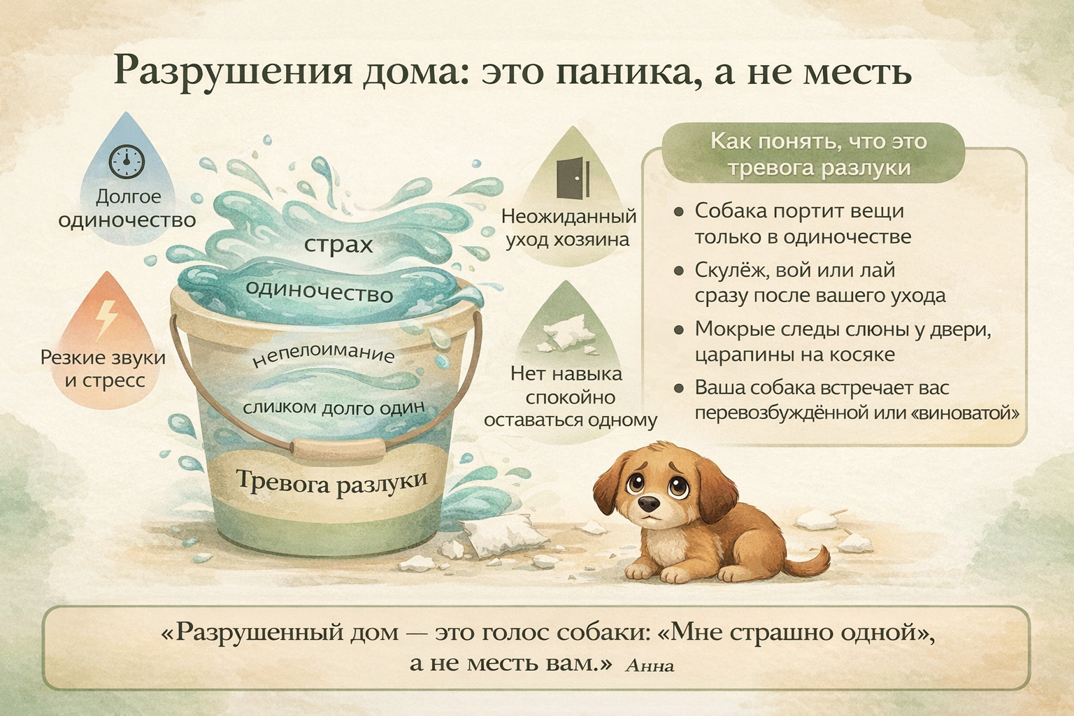 Если вы читаете это и внутри отзывается: «да, это про нас», вы уже сделали первый шаг — увидели за «испорченными вещами» живой страх вашей собаки. И это самое важное.