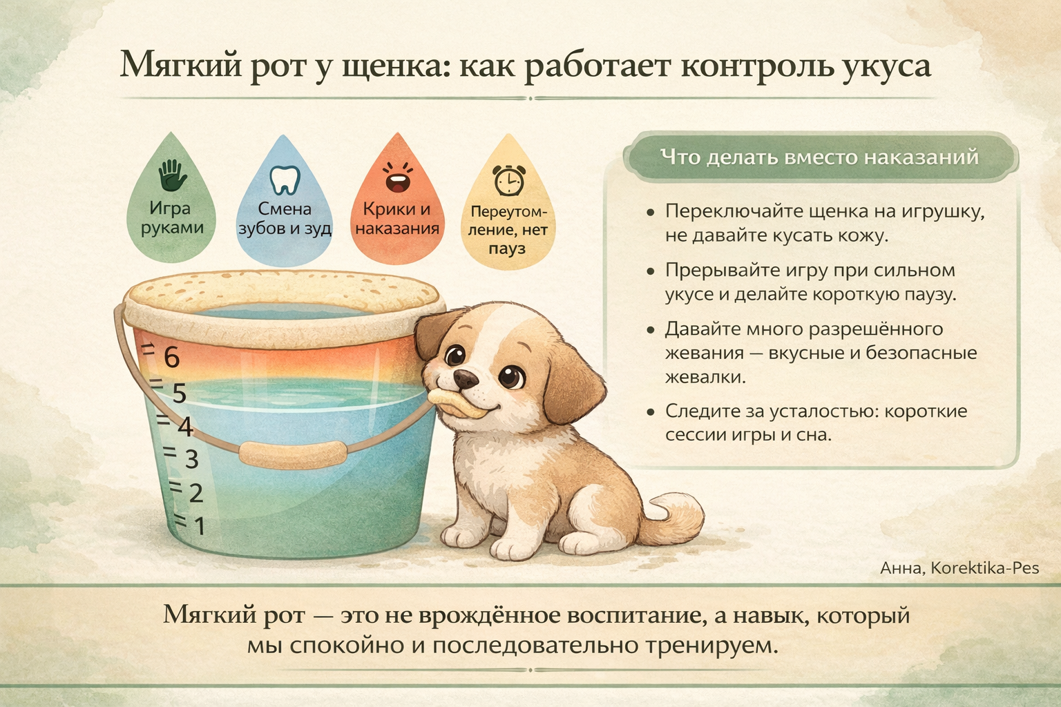 Мягкий рот щенок осваивает постепенно, через много повторов и очень понятные правила. Ваша задача — не «запретить кусаться вообще», а научить дозировать силу укуса и предлагать приемлемые альтернативы. Ниже — опорные принципы, а не жёсткий протокол по минутам.