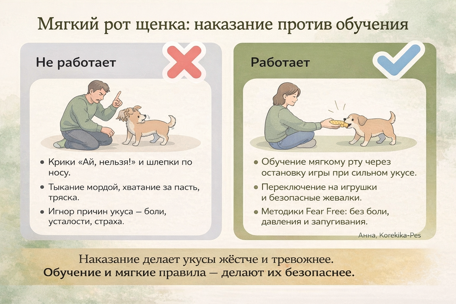Наказание за укусы учит щенка бояться ваших рук, но не понимать, как можно по-другому. В результате он может перестать предупреждать, замирать и неожиданно сильно кусать уже взрослой челюстью. Гуманная коррекция мягкого рта работает лучше и безопаснее.