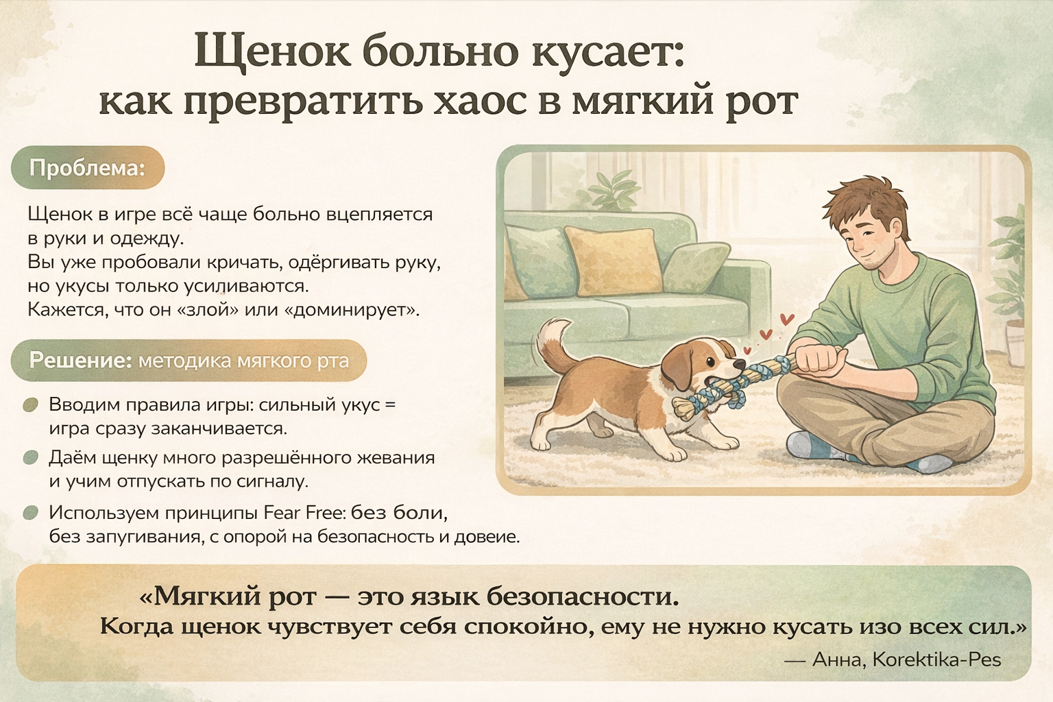 Мягкий рот щенок — фраза звучит очень нежно, правда? А в реальности вы отдёргиваете руку, щенок висит на штанине, пятки в синяках, и в голове только одно: щенок кусает, что делать и когда это уже закончится. Кажется, что он вообще не контролирует силу укуса и специально больно хватает.