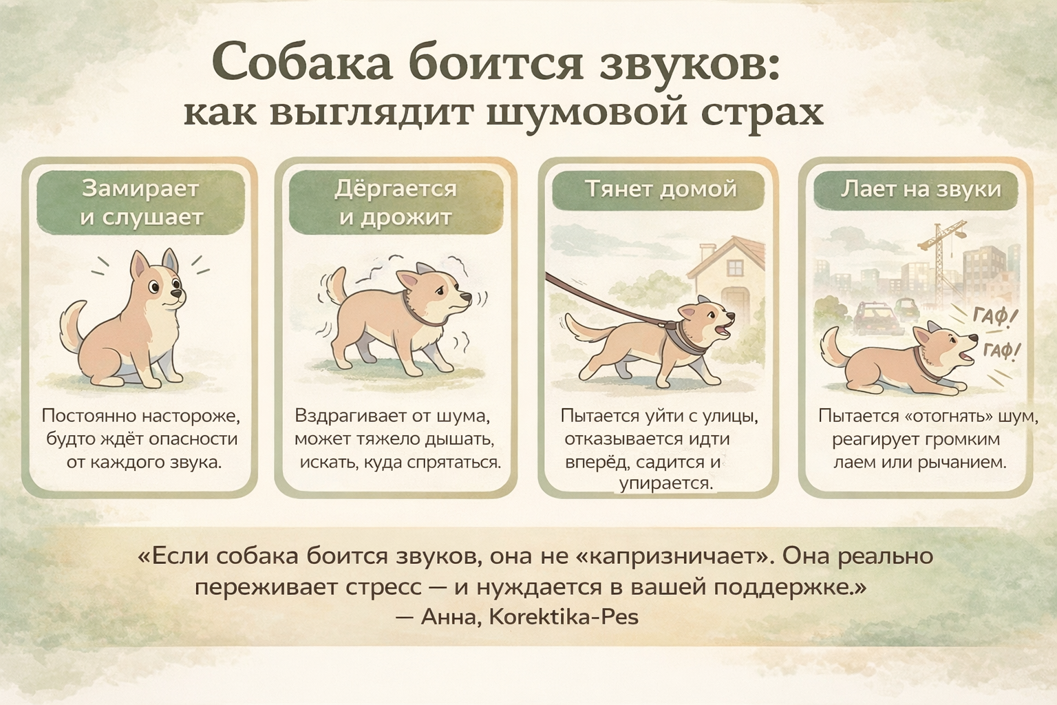 На консультациях в Korektika-Pes я часто слышу: «Она же должна привыкнуть к городу, все собаки гуляют и ничего». Но страх шума — не упрямство и не «испорченный характер», а реакция нервной системы. Разберёмся, почему собака так реагирует и как мягко снизить её тревогу без рывков и принуждения.