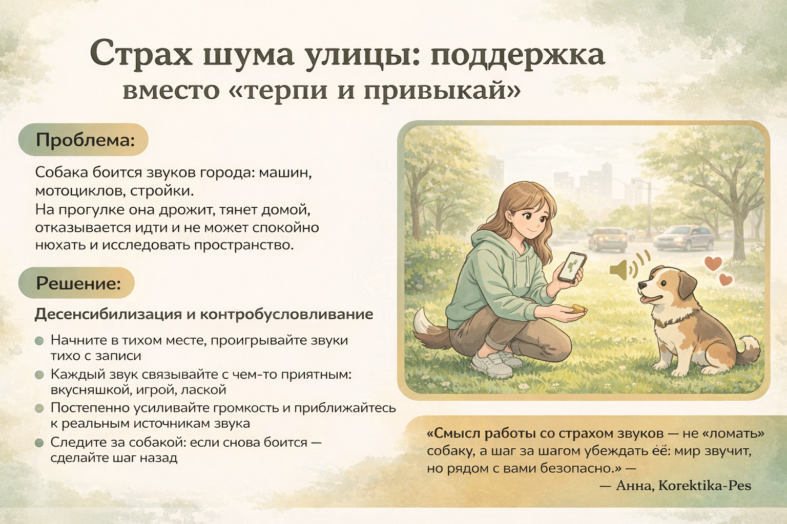 По опыту Korektika-Pes, раньше или позже собака начинает по-другому реагировать на реальные звуки города. Там, где раньше были рывок назад и попытка убежать, появляется пауза: она услышала, посмотрела на вас, взяла лакомство. Это и есть первый признак, что коррекция поведения при страхе звуков пошла в нужном направлении — у неё появился выбор и опора на вас.