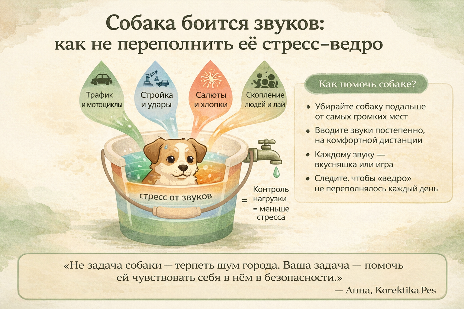По опыту Korektika-Pes, к этому часто добавляется ещё и «переполненное стресс-ведро»: собака мало отдыхает, долго остаётся одна, на прогулках её дёргают за поводок, и каждый новый звук попадает в уже полный стакан. Тогда даже не очень громкие шумы становятся последней каплей, и вы видите дрожь, рывки назад, попытки спрятаться или, наоборот, резкий лай на всё подряд.