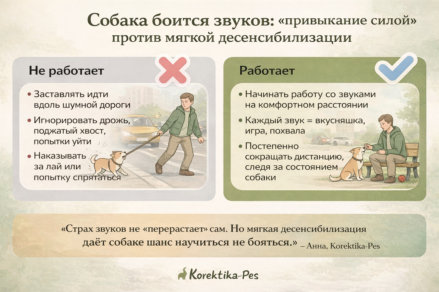 Заставлять собаку привыкать к шуму, затаскивая её на громкие улицы «пока не перестанет бояться», опасно и неэффективно. Такой подход часто только усиливает страх и делает прогулки тяжёлым испытанием для всех.
