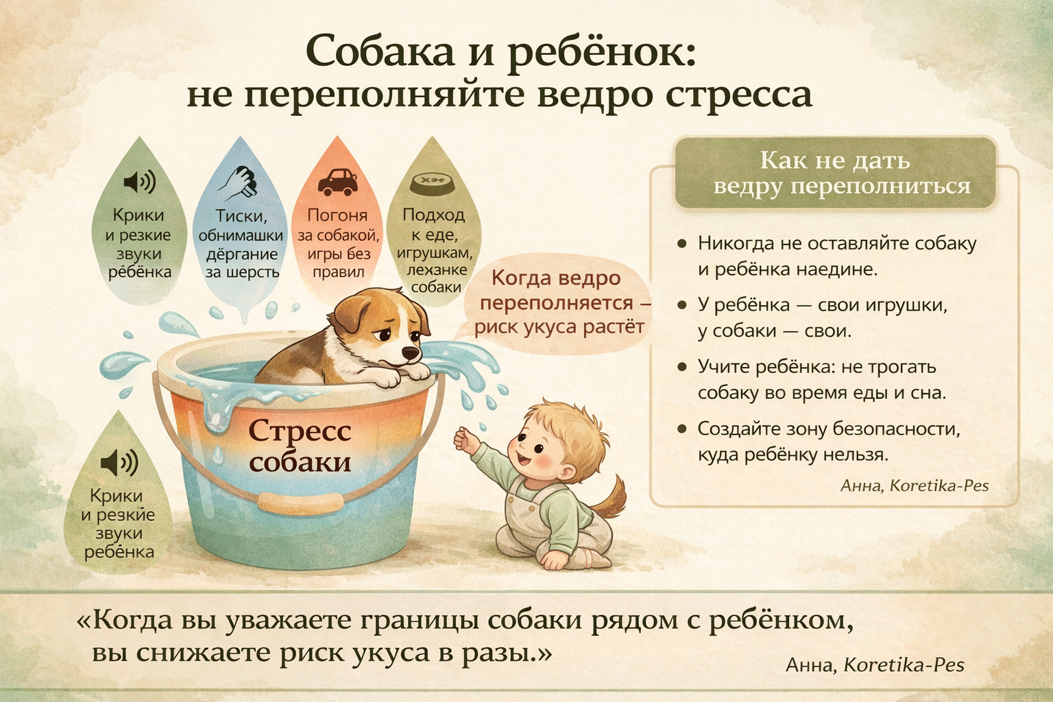 Метафора «ведро стресса» помогает понять риск укуса собаки ребёнка.