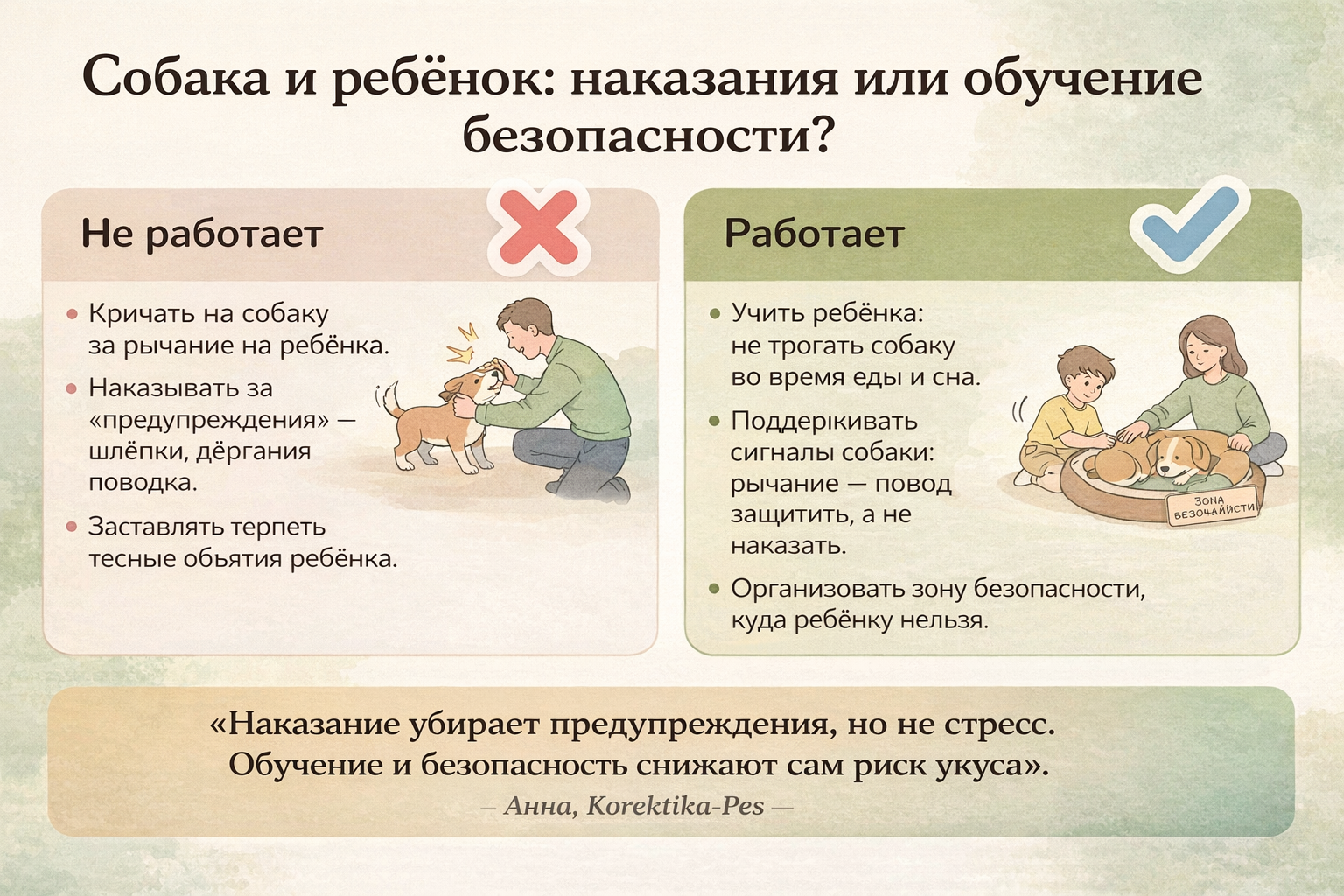 Сравнение: наказания против обучения безопасному общению ребёнка с собакой.
