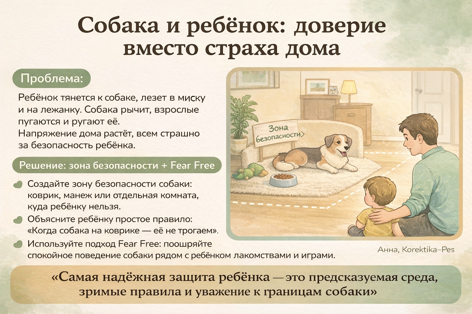 Современный подход Fear Free говорит о том, что безопасный дом — это не только про запреты, но и про продуманную среду. У собаки должна быть своя зона безопасности — место, куда ребёнку нельзя. У ребёнка — свои правила ребёнок собака: «к лежанке не подходим», «к собаке не лезем, когда она ест или спит». И над всем этим — ваш постоянный мягкий контроль.