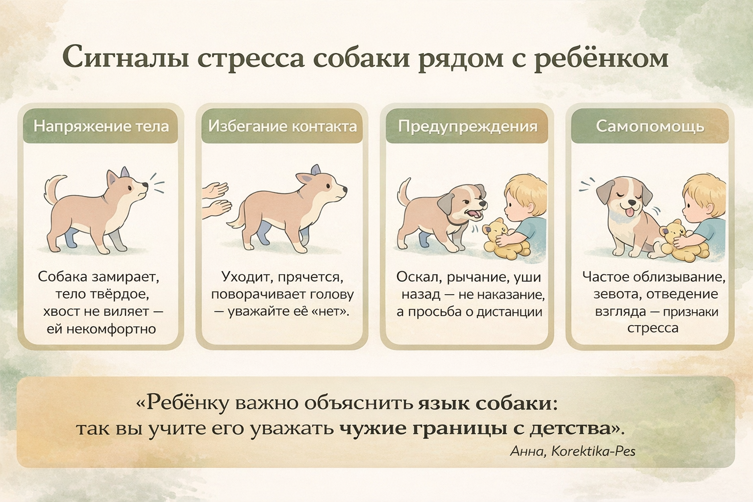 На консультациях Korektika-Pes я часто слышу: «Почему собака рычит на ребёнка, он же просто хотел обнять?». Если вы видите, что при приближении ребёнка собака замирает, отводит голову, уходит в сторону, прячется под стол — это уже ответ. Она говорит: «Мне тяжело, дай пространство».
