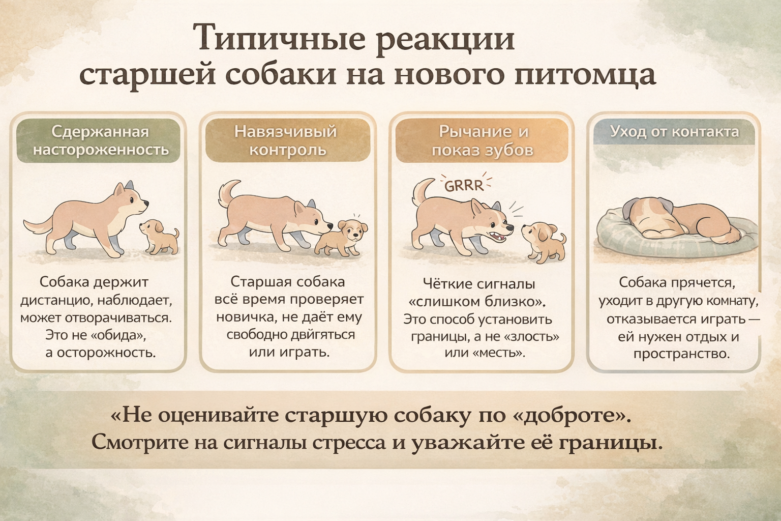 Кажется, что «она должна радоваться компании». Но вернёмся к главному: ваша взрослая собака не просила соседа по квартире. Для неё это внезапное вторжение в привычный мир, где уже были свои правила, запахи и предсказуемость. И сейчас нашей задачей становится не «сделать дружбу любой ценой», а мягко помочь собакам пережить этот период без стресса и драк.