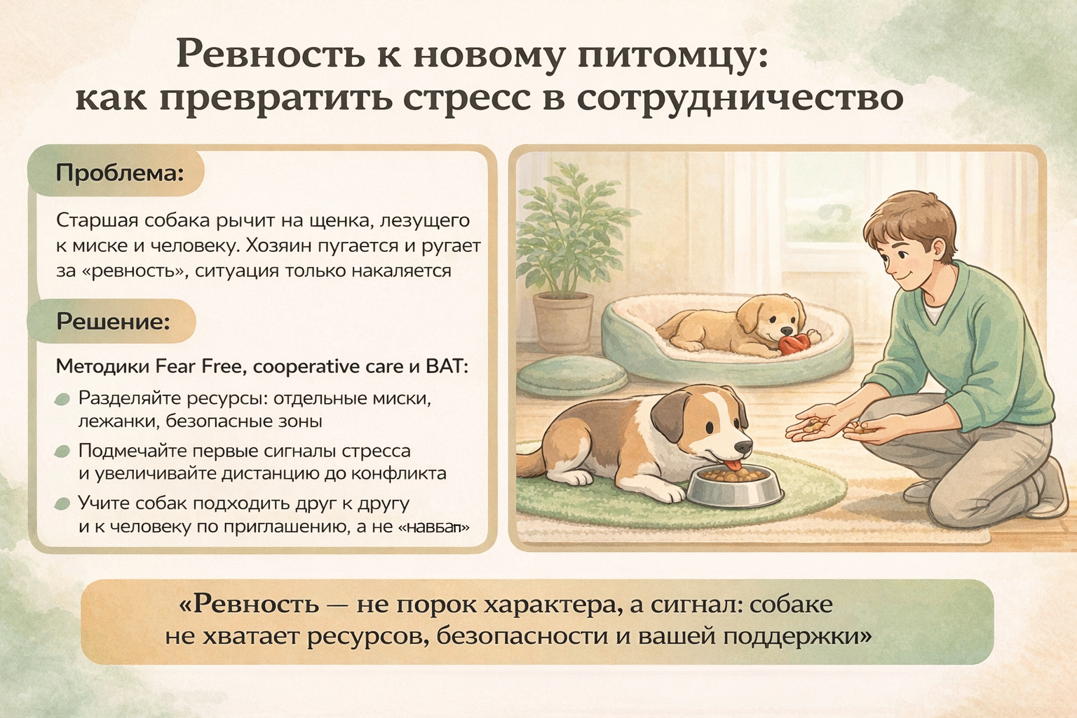 Если вам страшно «упустить момент» или вы не понимаете, где норма, а где уже тревожный сигнал, самое безопасное решение — обратиться к специалисту по коррекции поведения. Многие протоколы, связанные с ревностью и охраной ресурса, требуют тонкой настройки и знания ваших условий жизни, характера обеих собак, истории их взаимодействий.