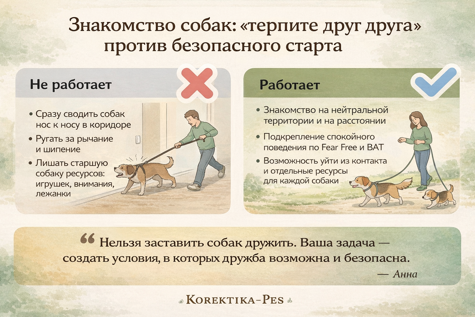 Если вы чувствуете, что ситуация выходит из-под контроля, собака проявляет агрессию к новому животному или вы просто боитесь ошибиться — не ждите беды. Запишитесь на консультацию, и мы вместе разберём, что именно тревожит вашу собаку, как организовать знакомство собак и жизнь с двумя питомцами так, чтобы всем было безопасно и спокойно. На консультациях в Korektika-Pes мы опираемся на современные подходы Fear Free, метод BAT и гуманную коррекцию поведения без боли и давления.
