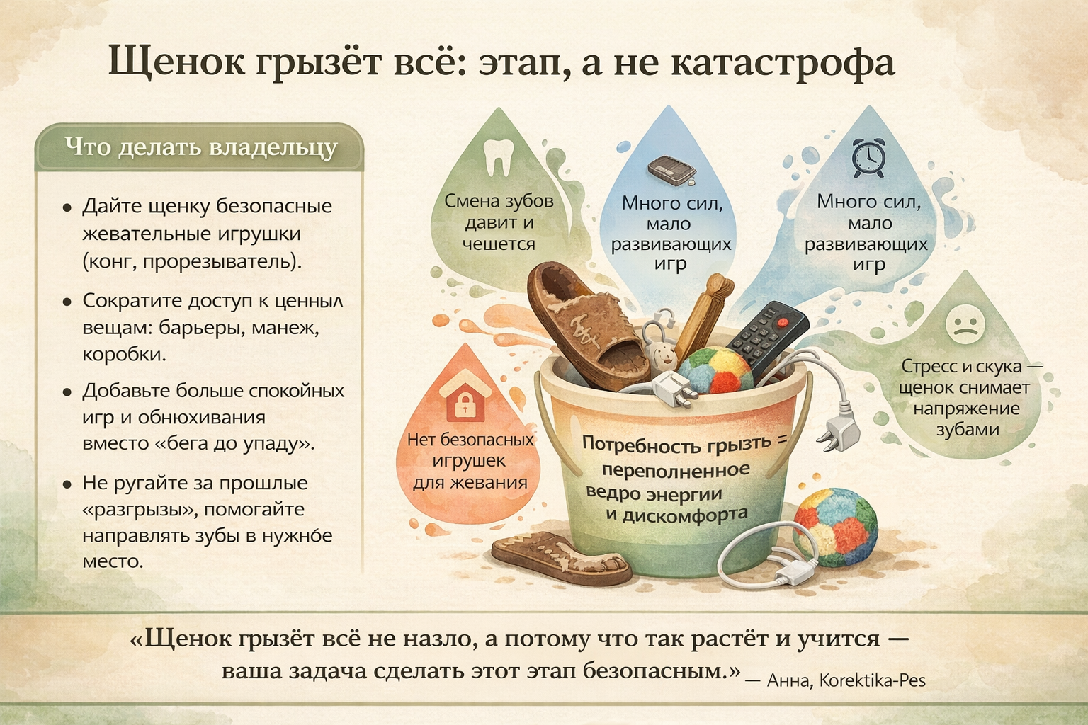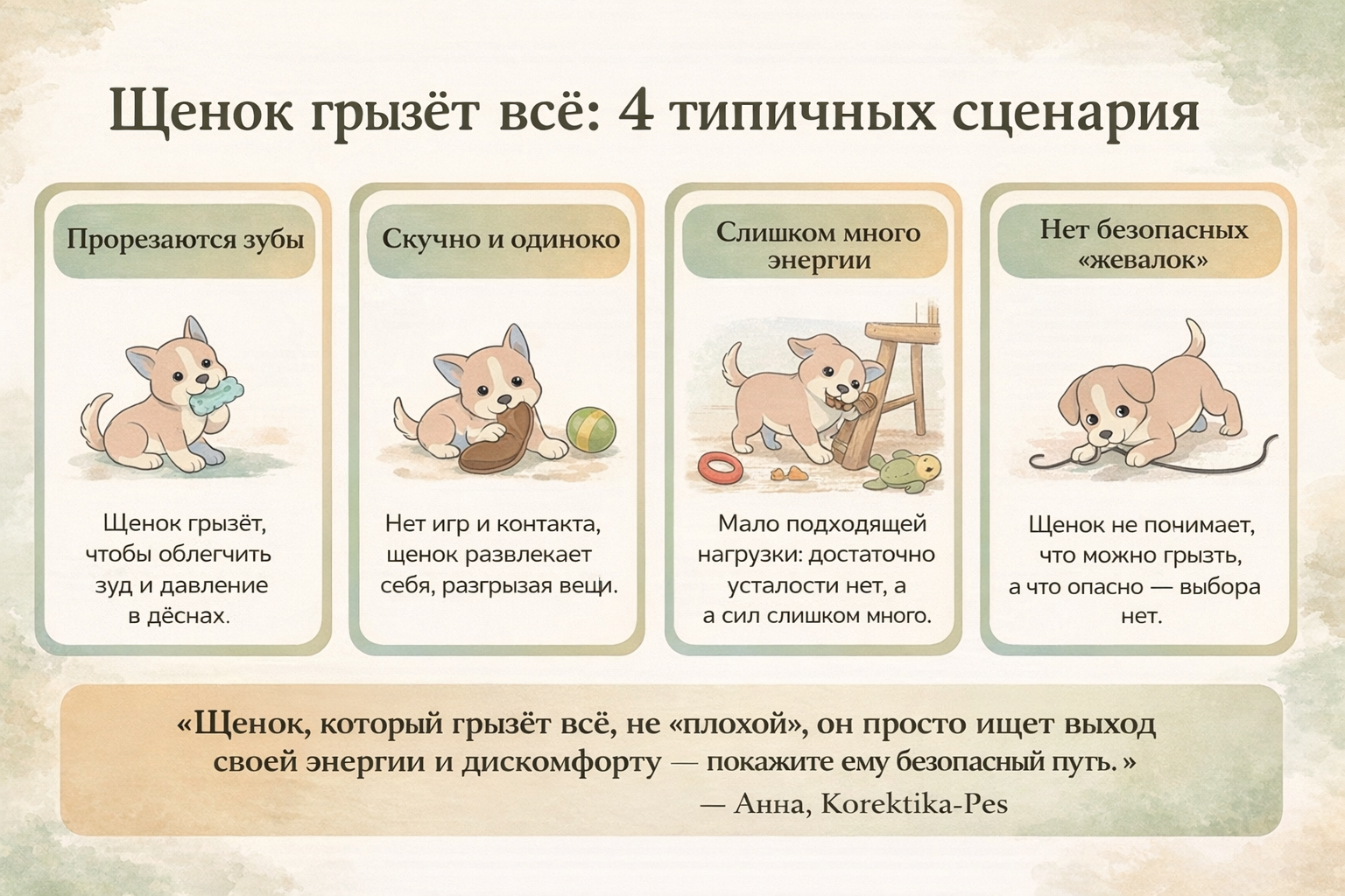 По опыту Korektika-Pes, как только мы удовлетворяем базовую потребность жевать безопасно и снижаем общий стресс, деструктивное поведение заметно уменьшается само по себе. То есть проблема не в том, что «щенок плохой», а в том, что ему пока не предложили удобный, понятный способ жить рядом с людьми.