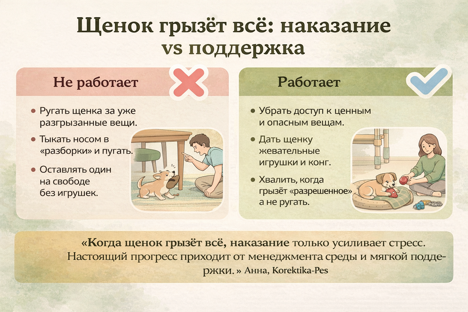Сравнение наказаний и мягкой поддержки, когда щенок грызёт всё дома.