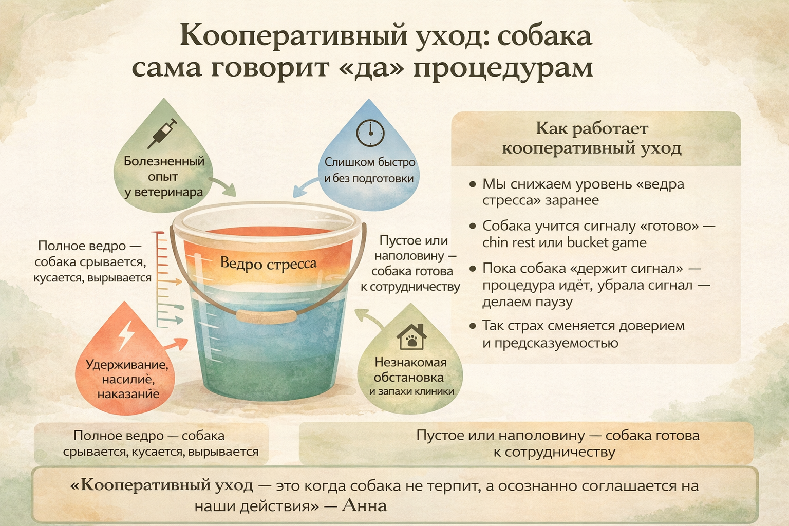 Метафора «ведро стресса» показывает, как кооперативный уход снижает тревогу собаки.