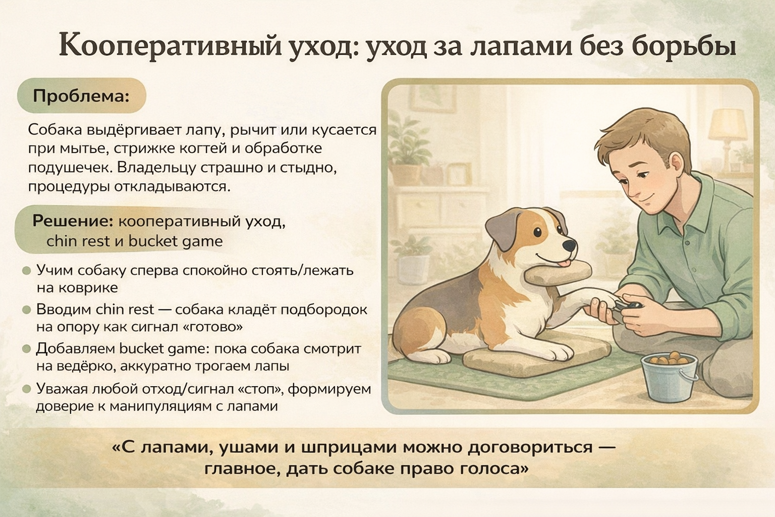 Кооперативный уход — это подход, при котором собака добровольно участвует в уходовых и медицинских процедурах и может в любой момент сказать «стоп» своим телом. Это не про дрессировку терпеть боль, а про уважение к границам и безопасное сотрудничество.