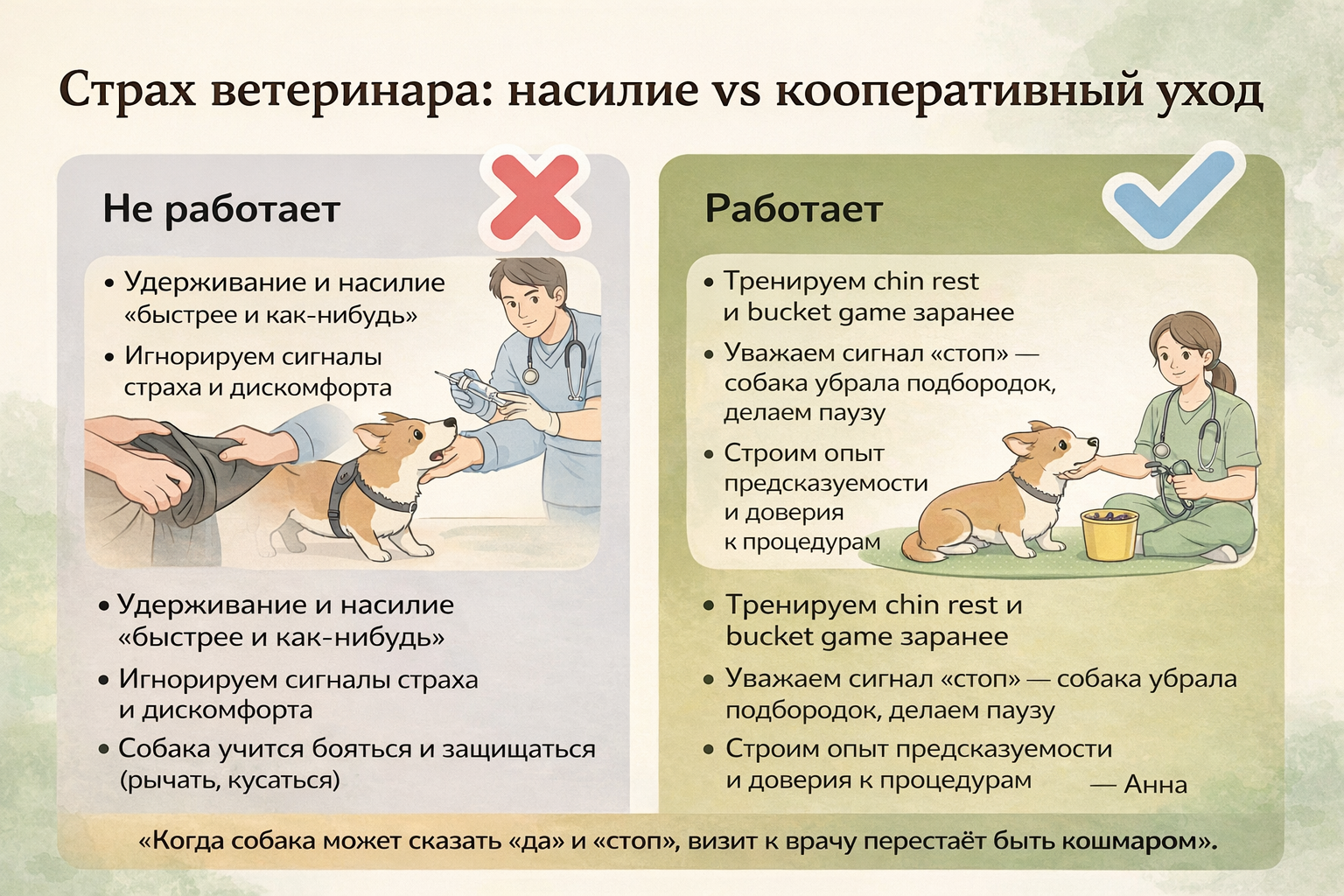 Если есть возможность, выбирайте мягкого ветеринара, который работает по принципам Fear Free: без лишней суеты, с паузами, с уважением к сигналам собаки. По опыту Korektika-Pes, союз «мягкий доктор + кооперативный уход дома» сильно сокращает количество стрессов даже у очень тревожных собак.