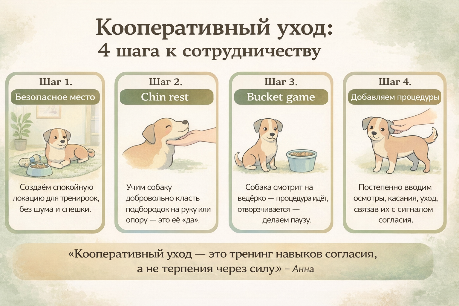 Четыре ключевых шага кооперативного ухода: от безопасного места до процедур.