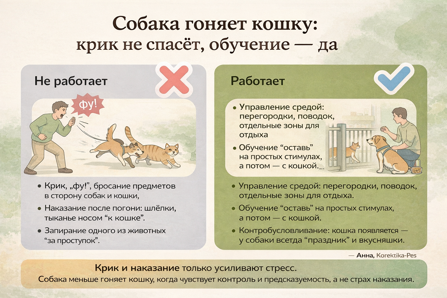 Остановить собаку-преследователя и наладить жизнь с кошкой помогает не один магический приём, а сочетание нескольких простых, но последовательных принципов. Их можно адаптировать под ваш дом и вашу пару «собака-кошка».