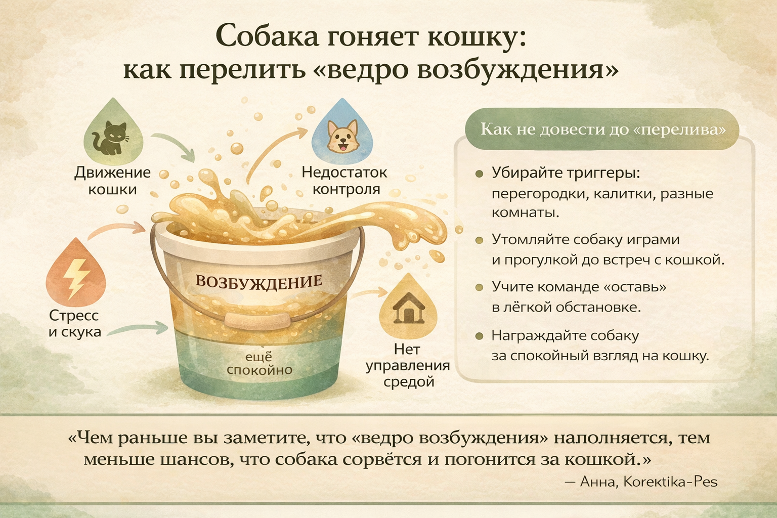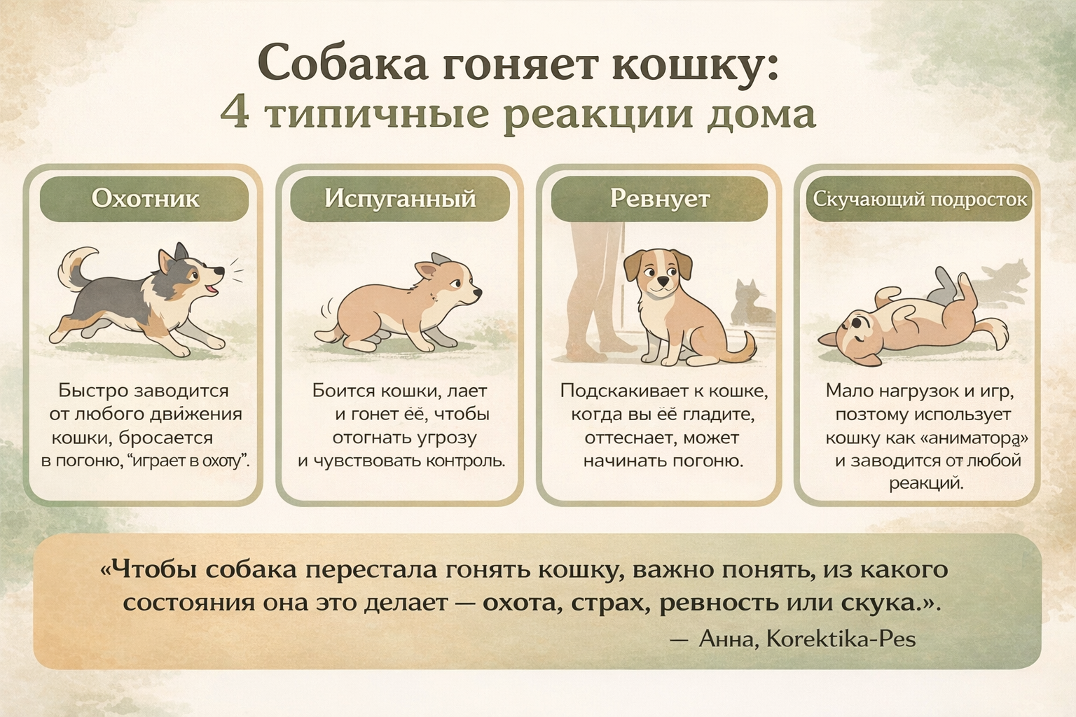 Собака гоняет кошку не из злобы и не из «ревности», а потому что включается охотничий инстинкт, скука, стресс или неумение общаться с кошками. Важно не искать виноватого, а понять, откуда берётся эта погоня именно у вашей собаки.