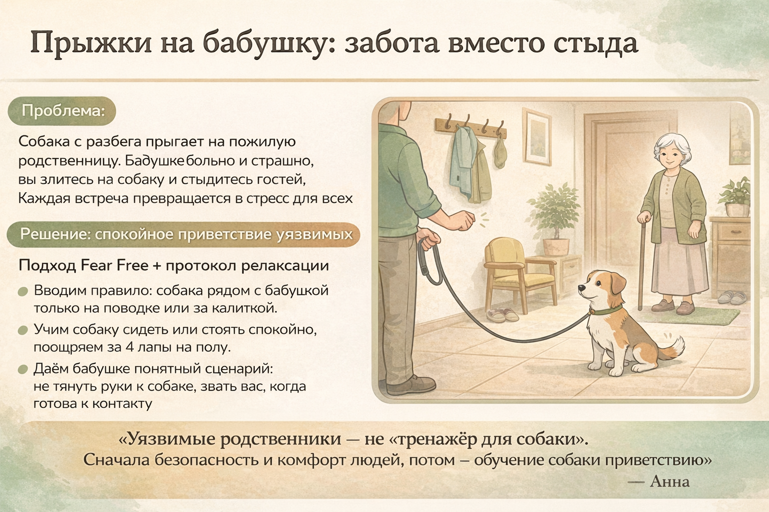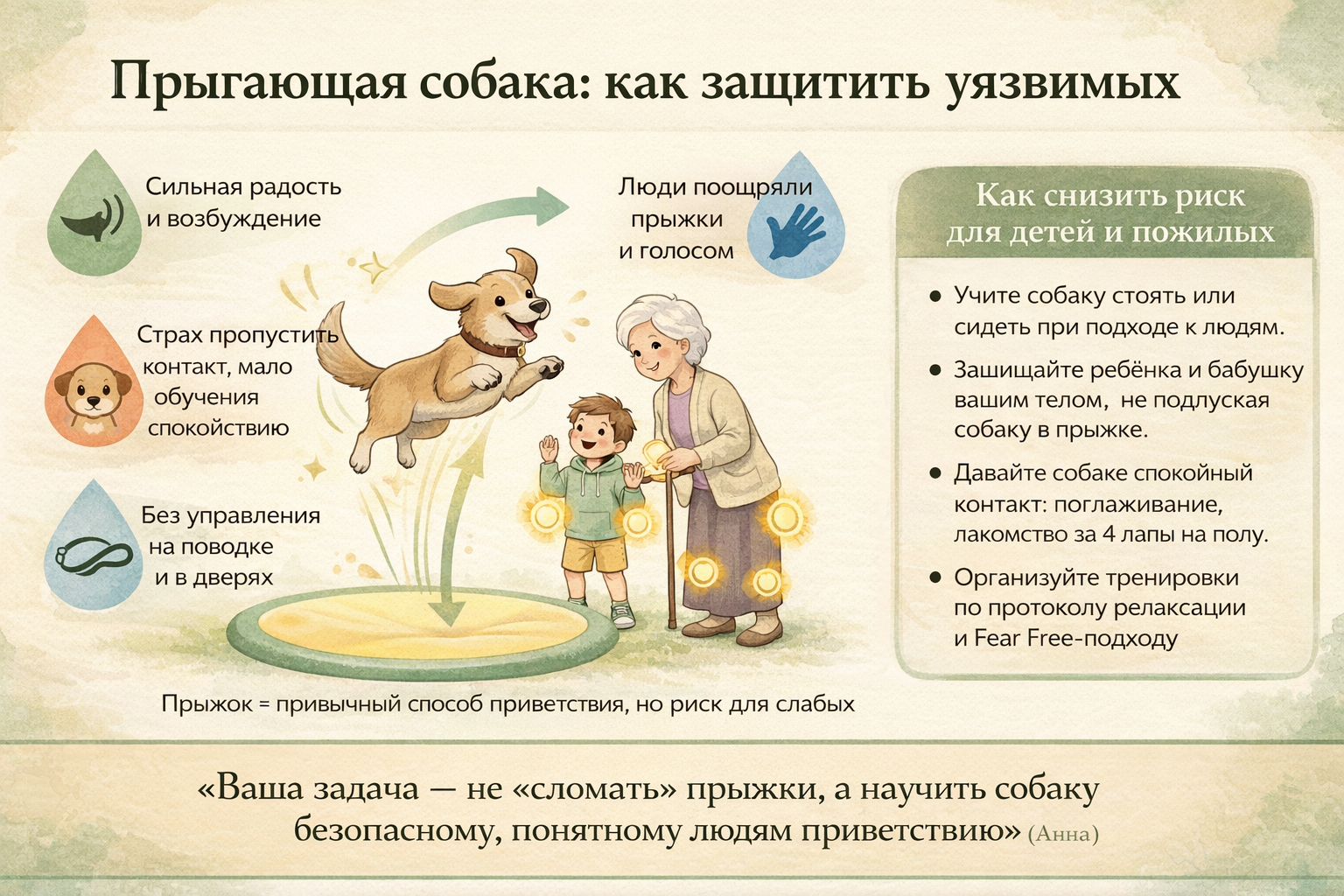 Если собака прыгает на бабушку, главная цель — немедленно снизить риск падения, а уже потом обучать новые привычки. Пожилому человеку часто достаточно одного толчка, чтобы получить серьёзную травму.
