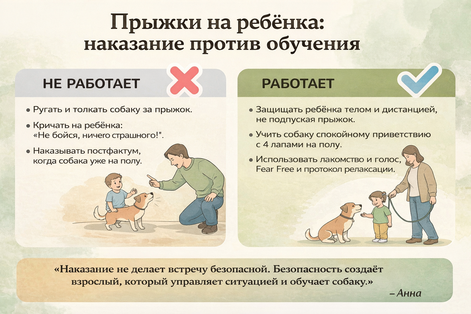 Вы входите в квартиру, впереди бежит ребёнок, за ним — ваша собака. В одну секунду собака прыгает, вешается на ребёнка, тот падает или еле удерживается на ногах. Все вроде смеются, но внутри все сжимается: собака прыгает на ребёнка, и вы понимаете, что один неудачный толчок — и травма. То же может случиться с бабушкой с хрупкими коленями. Эта статья как раз о том, как защитить уязвимых и при этом не ломать собаку наказаниями.