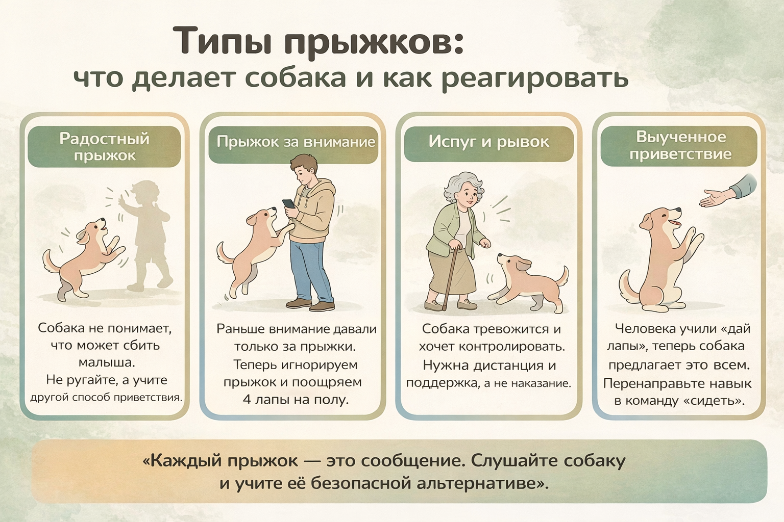 Маленькие, регулярные шаги — управление средой, тренировки спокойного приветствия, работа с возбуждением через протоколы релаксации — дают гораздо более устойчивый результат, чем жёсткие запреты и рывки. Если собака прыгает на ребёнка или пожилого человека часто и вы чувствуете, что ситуация выходит из-под контроля, лучше не ждать «первой серьёзной травмы».