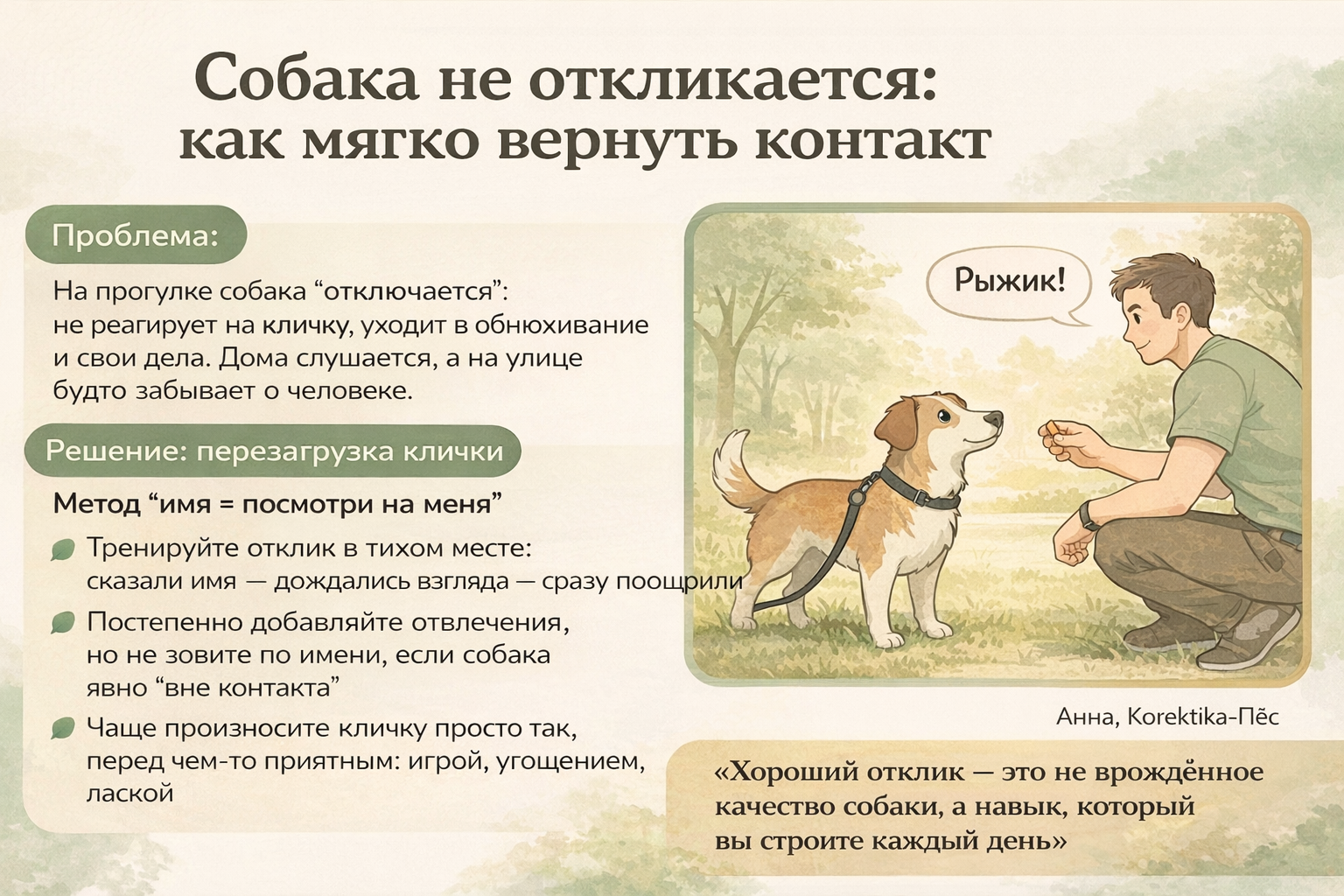 Отучить игнорировать кличку — это не «заставить слушаться», а заново зарядить имя приятными ассоциациями. Собака начинает откликаться, когда кличка надёжно предсказывает что-то для неё ценное и при этом звучит в посильных условиях, где она вообще способна вас услышать.