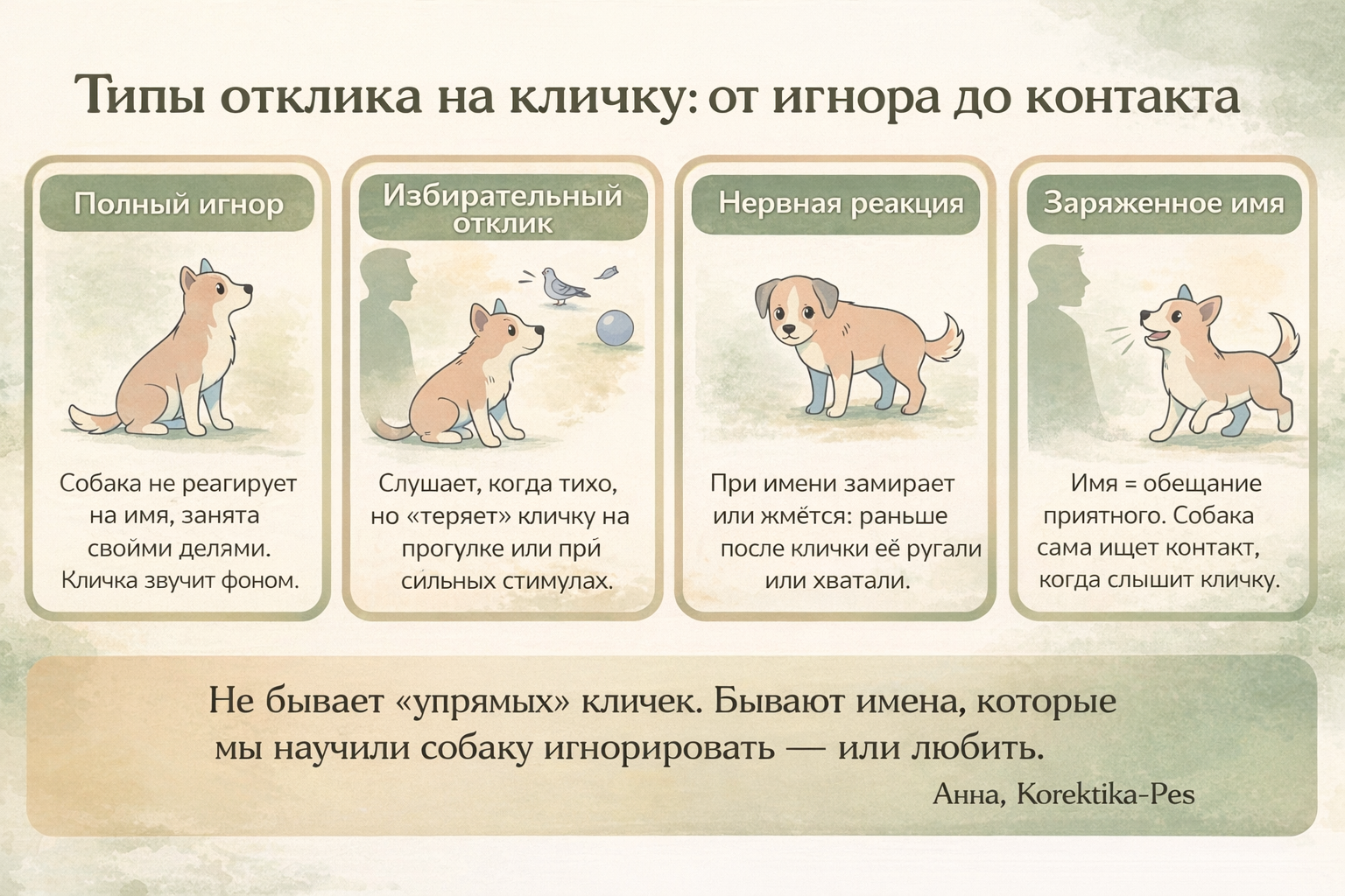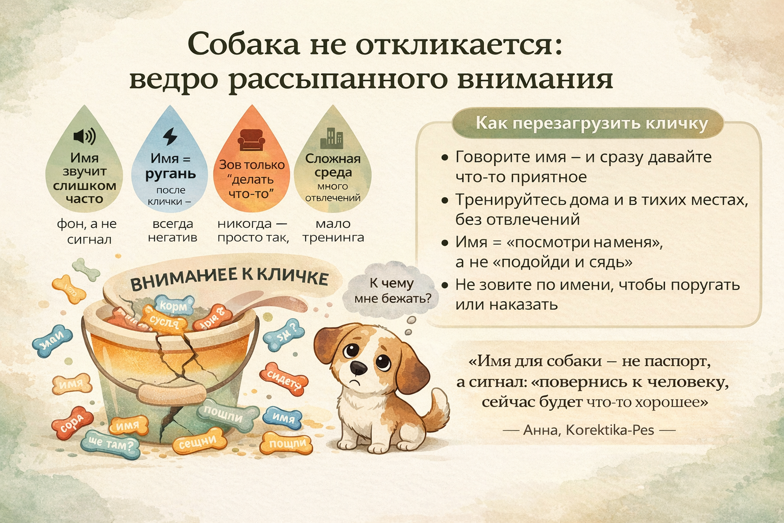 С точки зрения собаки кличка — просто звук. Смысл этому звуку придаём мы через ассоциации. Если имя чаще звучит, когда нужно прекратить что-то приятное («Пошли домой!», «Перестань играть!»), если после него бывает крик или рывок, кличка постепенно превращается в отравленный сигнал. Специалисты называют это **»отравленная кличка»** — когда имя предвещает неприятности, и мозг начинает его будто «не слышать».