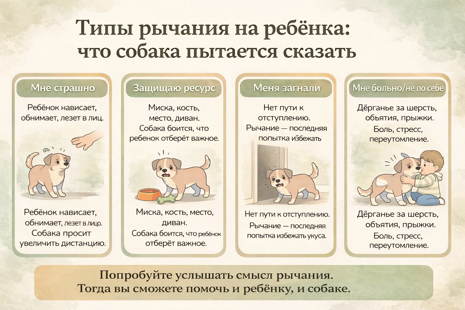Если сейчас у вас в голове крутится «почему собака рычит на ребёнка именно у нас, ведь она раньше была такой ласковой», ответ часто в накопившемся опыте. Собака много раз терпела шумные игры, внезапные падения ребёнка на себя, хватания за шерсть. Вначале она просто уходила, потом стала напрягаться, зажиматься, а однажды поняла, что «уйти» не получается — и включила рычание как единственный работающий способ достучаться.