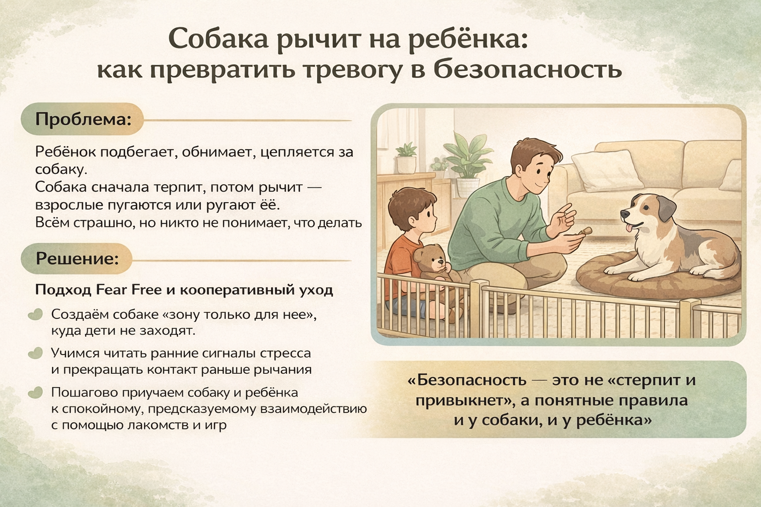 К этим шагам я часто добавляю элементы подхода Fear Free и кооперативного ухода: собака учится, что любые процедуры и взаимодействия (в том числе с ребёнком) происходят только тогда, когда ей не страшно, и она может отказаться. Это сильно снижает общий уровень тревоги. О хороших практиках в этом подходе можно почитать, например, у организации Fear Free (англ.).