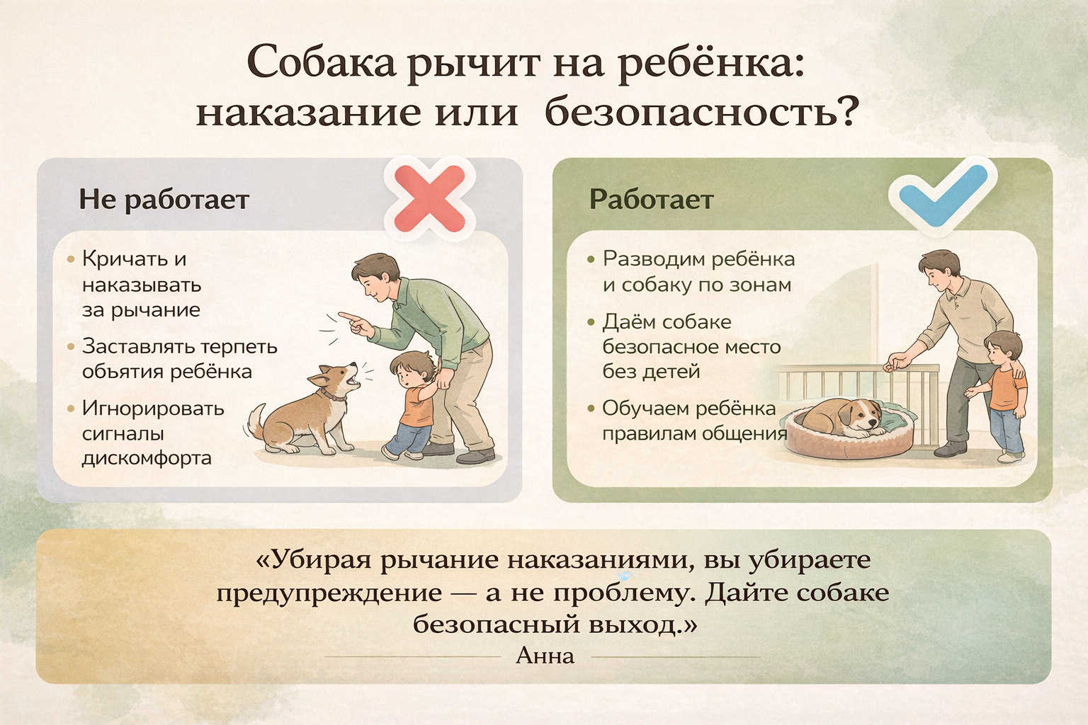 Тут важно остановиться: вы не обязаны уже всё это знать. Никто не выдаёт вместе с ребёнком и щенком подробную инструкцию по совместной жизни. Наша задача сейчас — не искать «кто начал», а перестраивать систему так, чтобы и ребёнку, и собаке было по-настоящему безопасно.