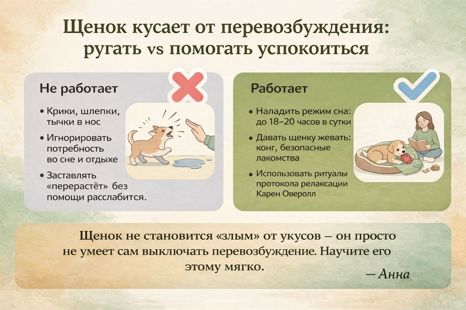 Сравнение ошибочного наказания щенка и работающих способов снизить перевозбуждение.