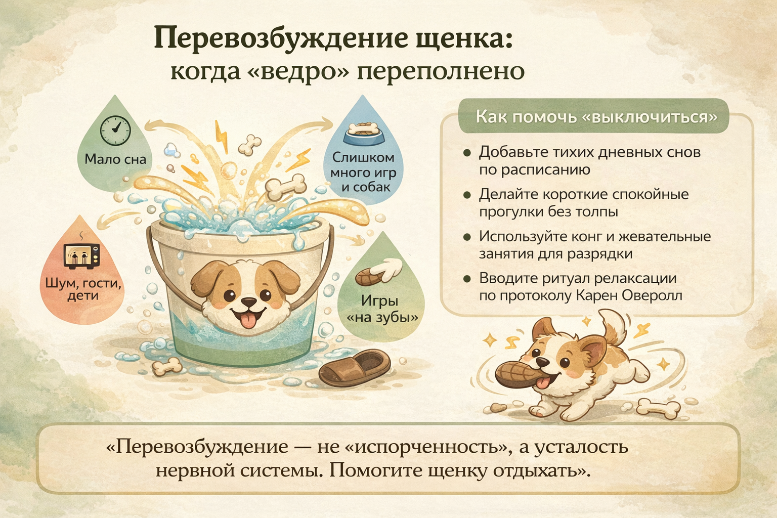 Метафора «переполненного ведра», объясняющая перевозбуждение щенка и способы помощи.