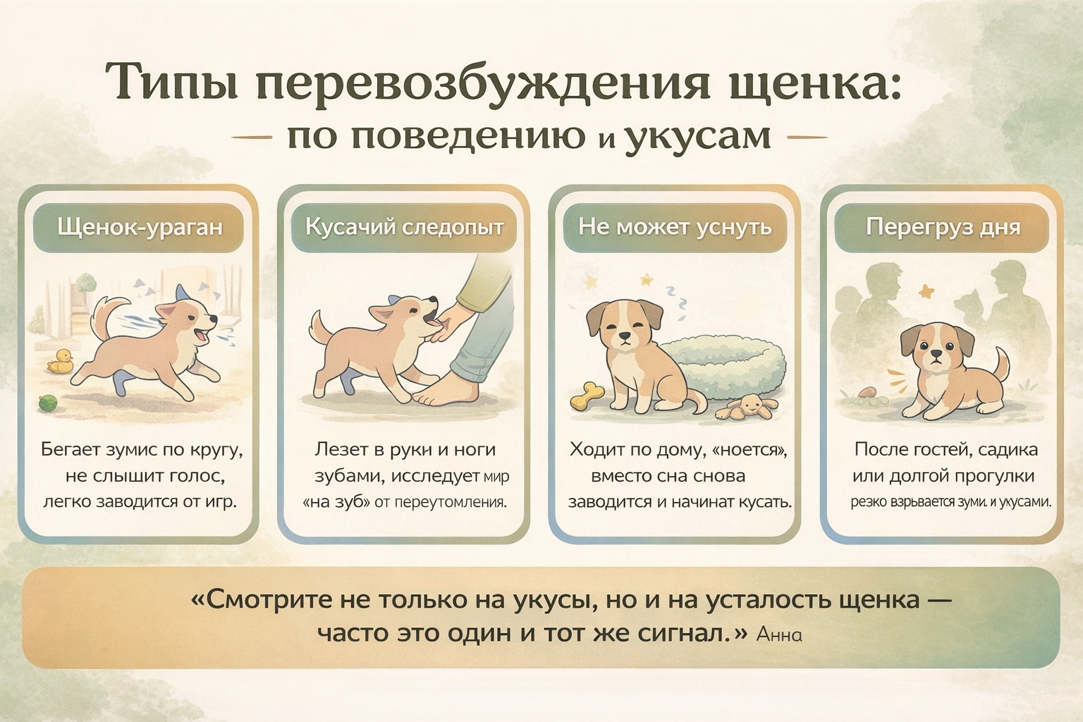 Карточки с основными типами перевозбуждения щенка и краткими пояснениями.