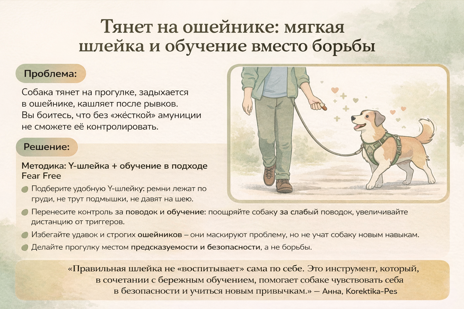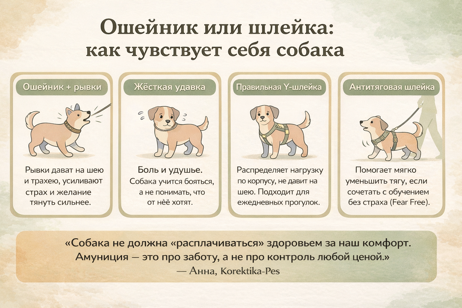 И ещё один нюанс, о котором редко говорят. Когда собаке физически комфортно, ей легче учиться новому. Глаза не зажмурены от боли, дыхание не перехвачено, мозг получает достаточно кислорода. А это значит, что упражнения на спокойную ходьбу и позитивное подкрепление работают в разы эффективнее. По опыту Korektika-Pes, просто смена с жёсткого ошейника на хорошо сидящую шлейку уже снижает уровень возбуждения на прогулке.
