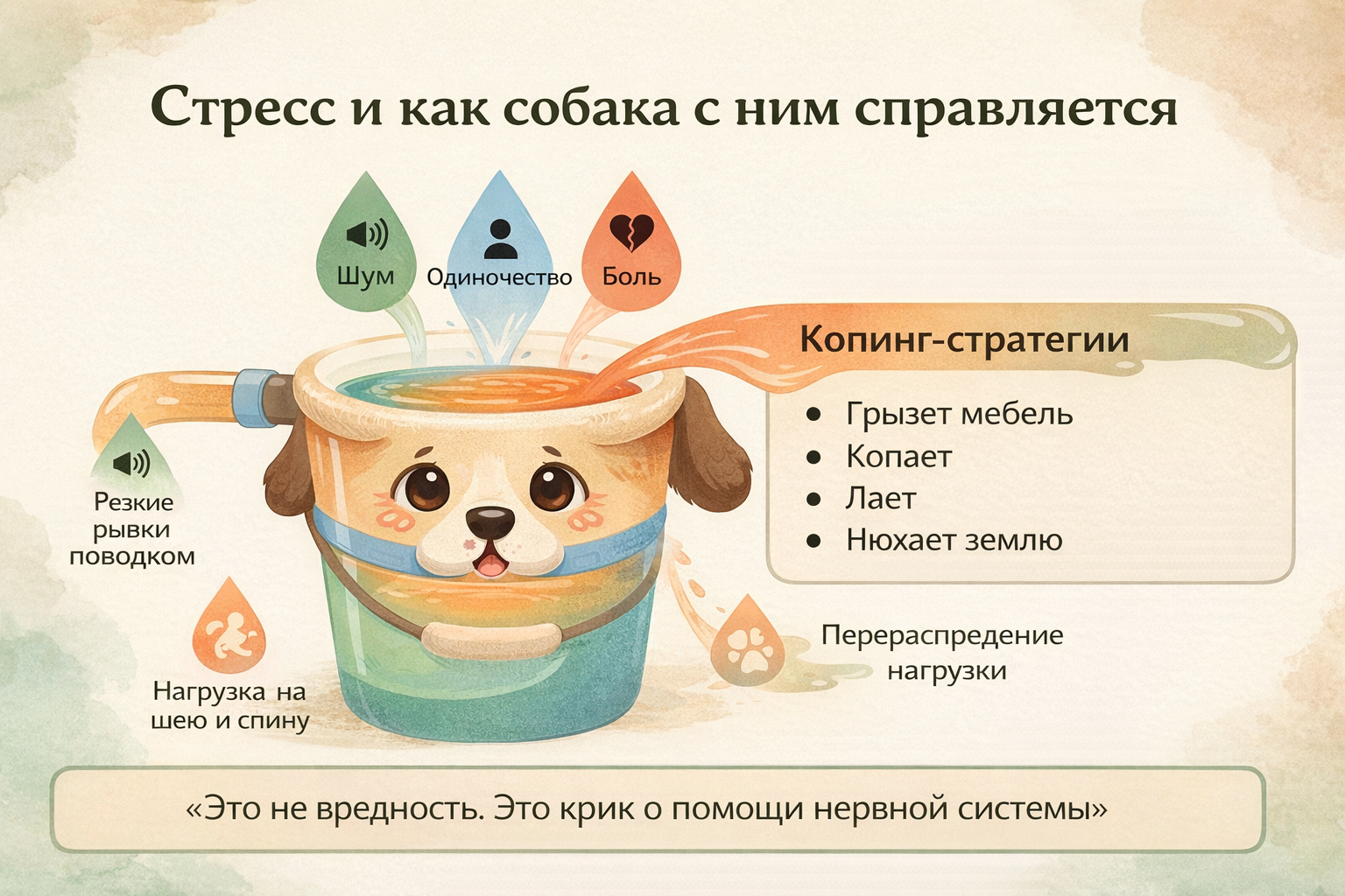 Давайте посмотрим на это глазами собаки. Она выходит на прогулку, и весь мир сразу «орёт» запахами, звуками, движением. Тело реагирует быстрее головы: мышцы напрягаются, дыхание учащается, и лапы сами несут вперёд. В этот момент собака не думает «я тяну, чтобы доминировать», она просто не умеет по-другому проживать этот собачий стресс.
