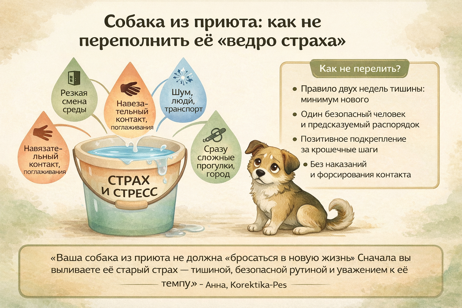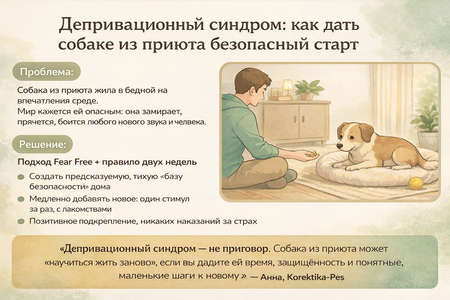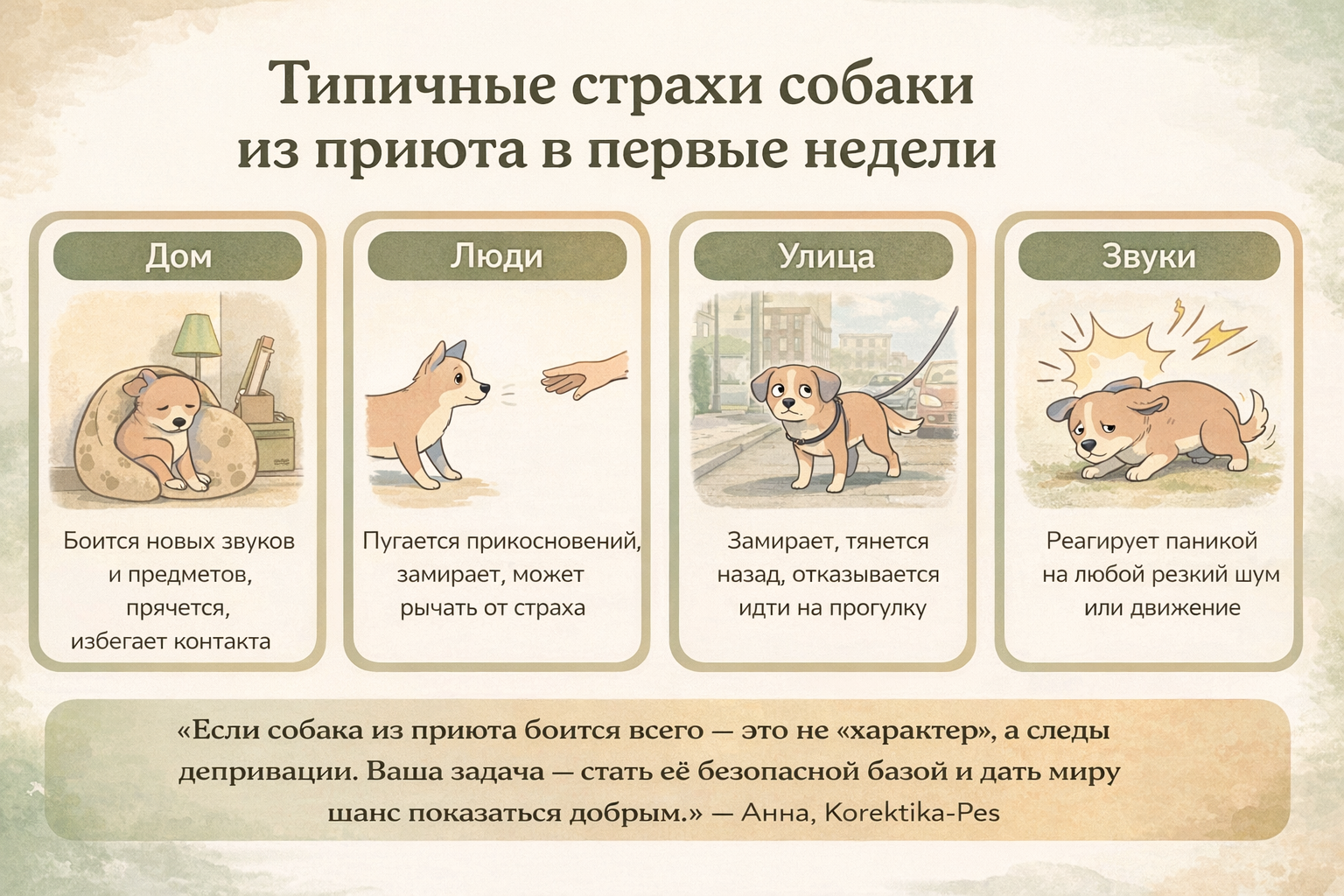 Привет, я Анна из Korektika-Pes. Представьте: вы забрали собаку из приюта, открываете перед ней дверь дома, а она словно схлопывается внутрь себя — жмётся к стене, не ест, вздрагивает от любого звука. Кажется, что вы всё сделали правильно, а в ответ только страх и пустой взгляд.