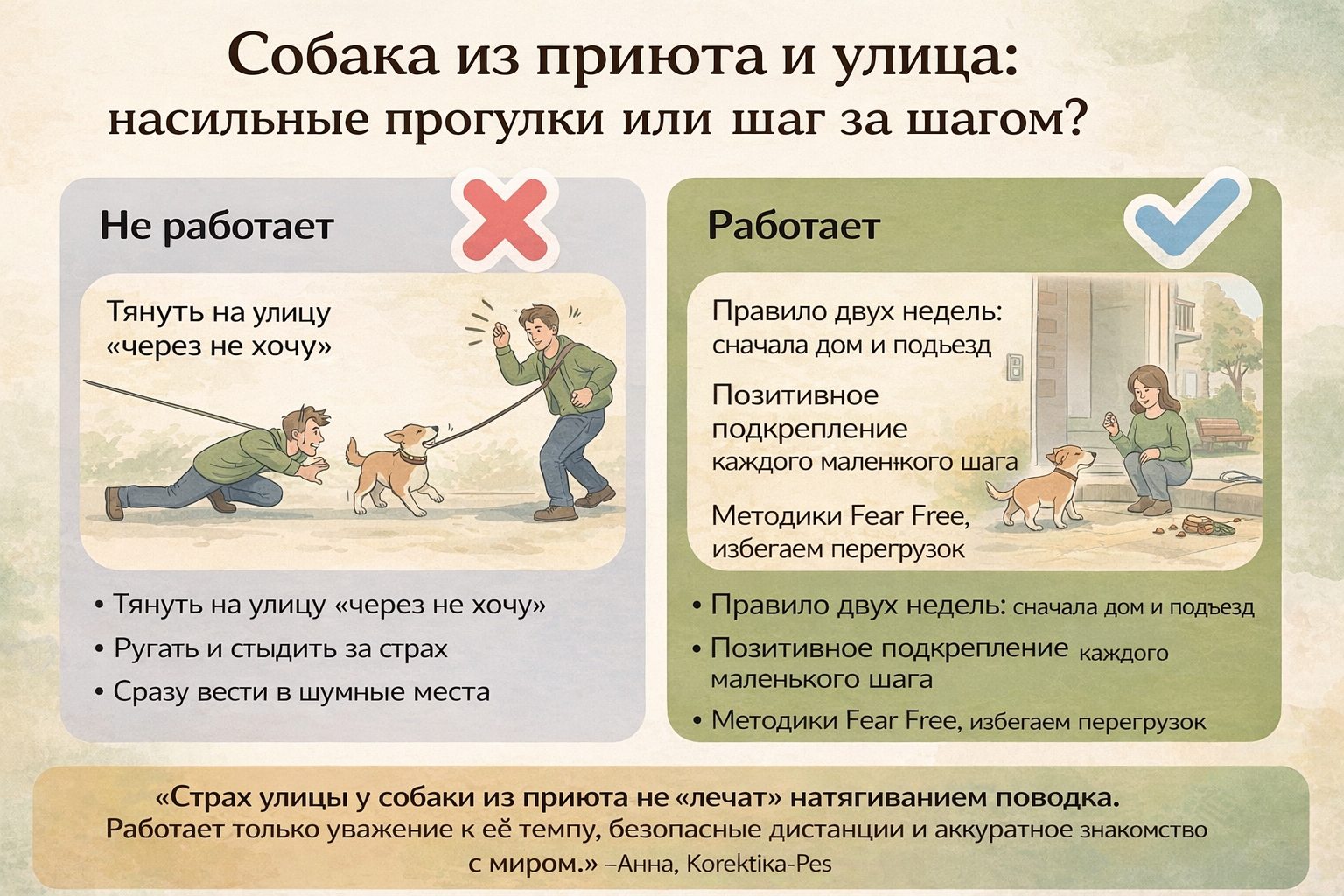 Когда собака из приюта боится выходить на улицу, это почти всегда про перегрузку: слишком много звуков, запахов и движущихся объектов, с которыми она не умеет справляться. Важно не тащить её «через не могу», а разбить улицу на маленькие, посильные шаги.